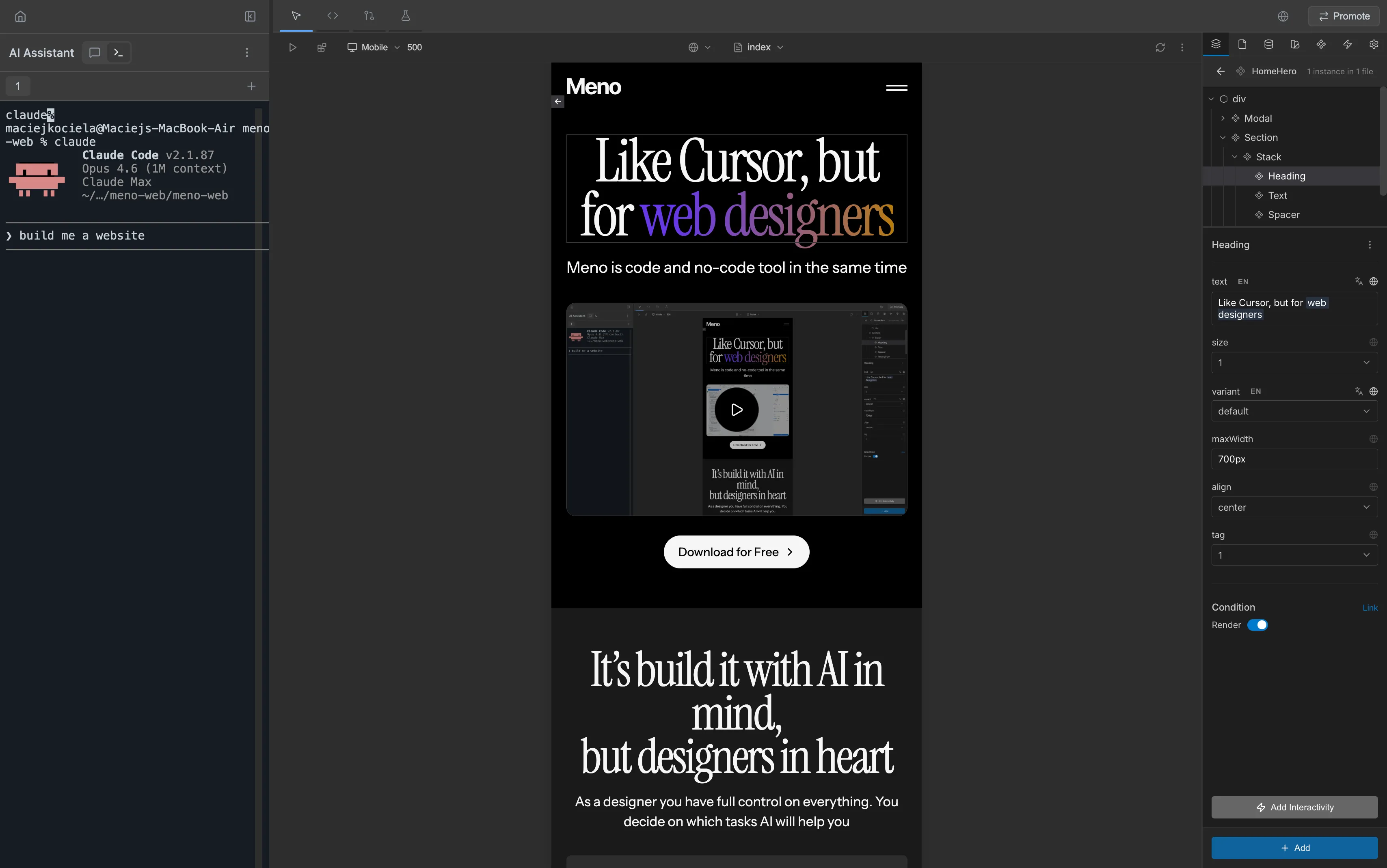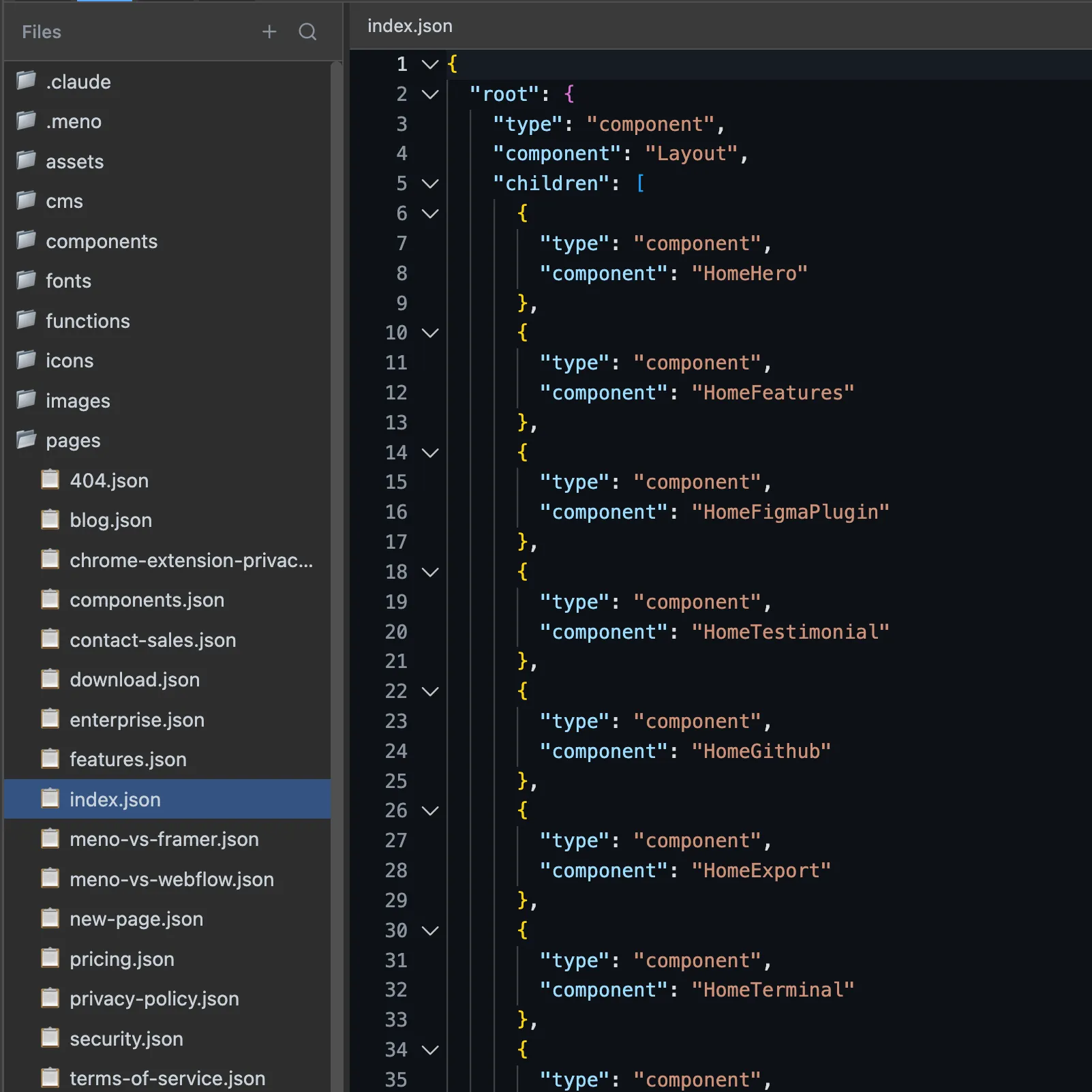 Meno projects are plain JSON files in a Git repo. That means any terminal-based AI tool can read, edit, and build your site. Claude Code works best — it understands the Meno structure and can create full pages and components from a single prompt.