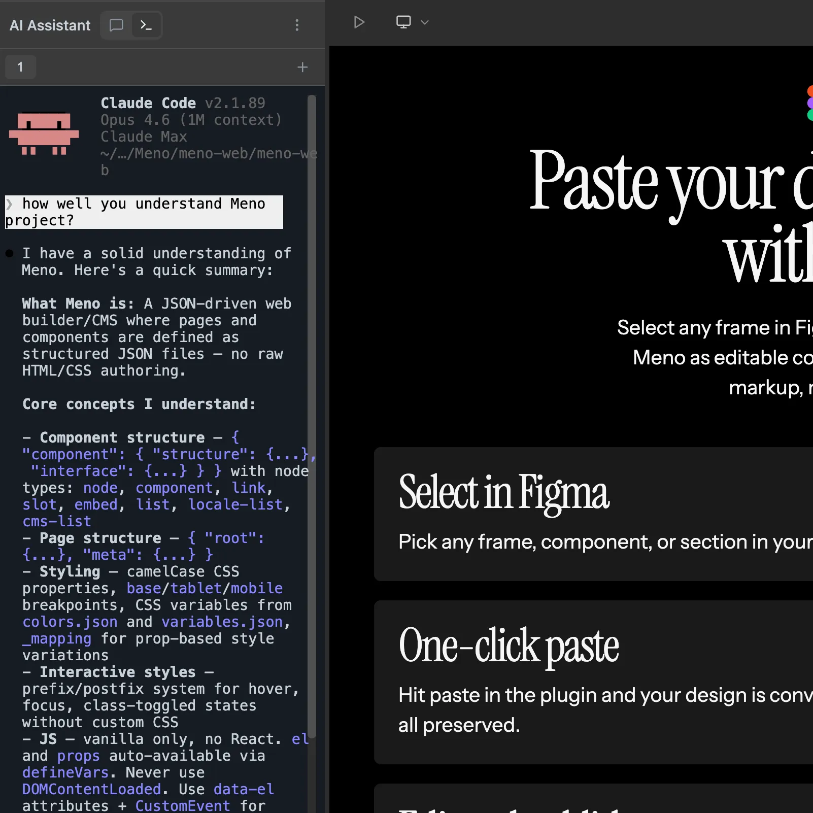 Select any frame in Figma, click paste, and watch it appear in Meno as editable components. No export, no copy-paste markup, no rebuilding from scratch.